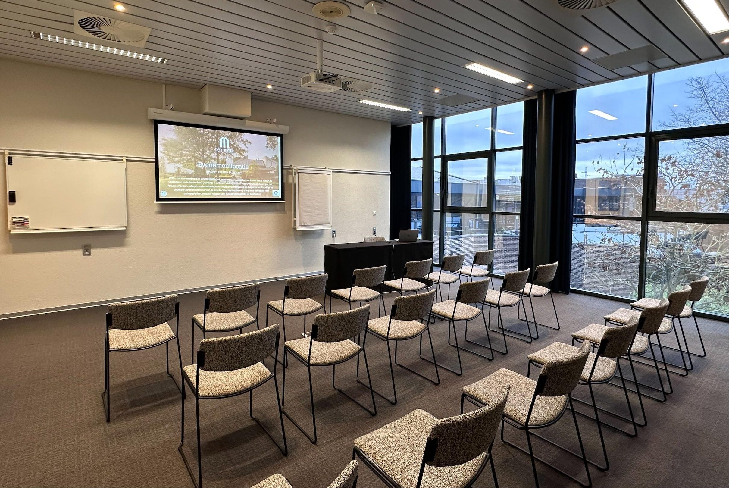 Elke zaal is aangenaam ingekleed en is voorzien van sfeervolle ledverlichting die u kan dimmen of uitschakelen in functie van uw presentatie. Het klimaat kan tevens geregeld worden in functie van uw wensen.