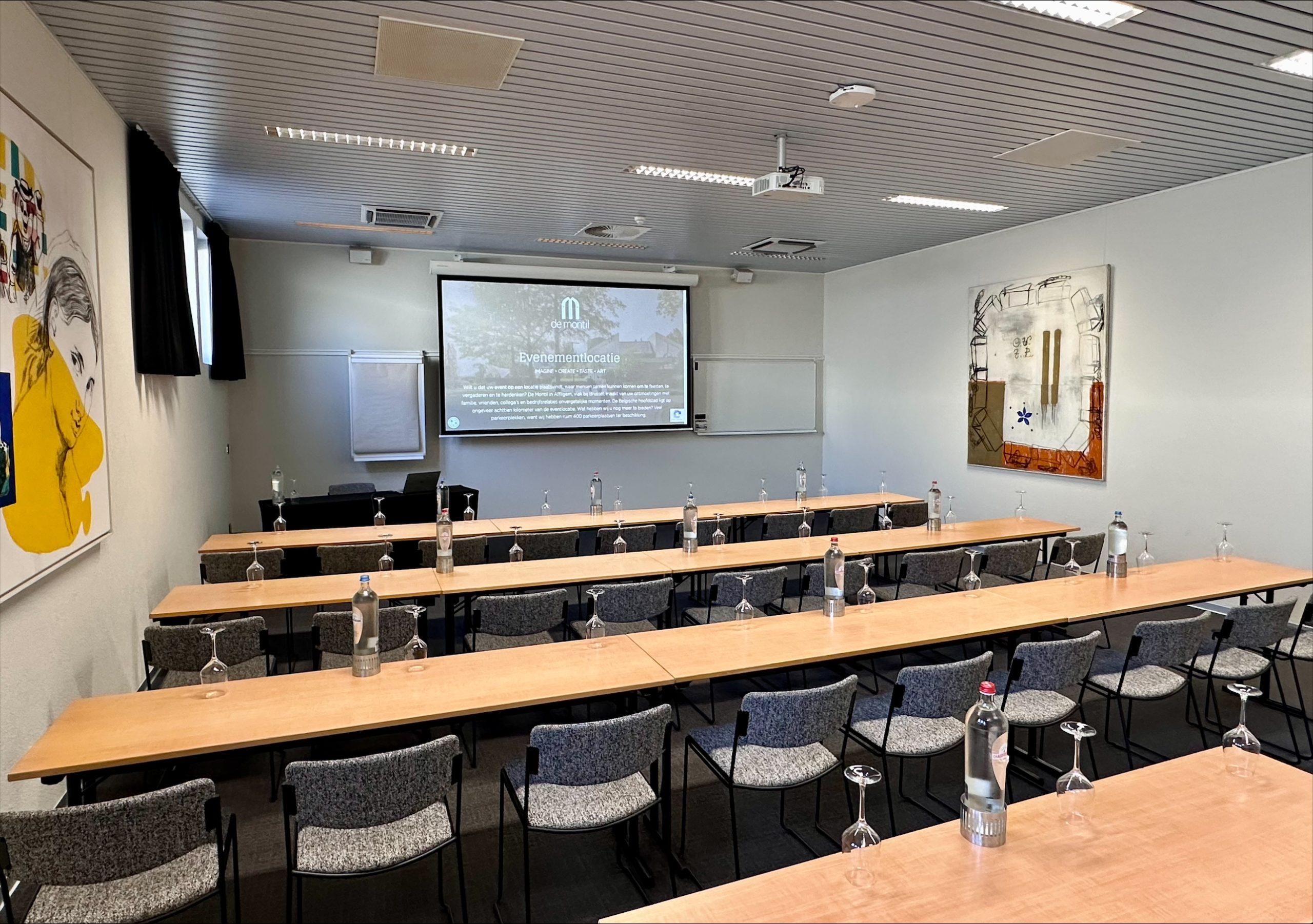 De vele ramen zorgen voor een natuurlijke lichtinval. Doch kan deze zaal volledig verduisterd worden waardoor uw presentatie in de meest optimale situatie kan plaatsvinden.