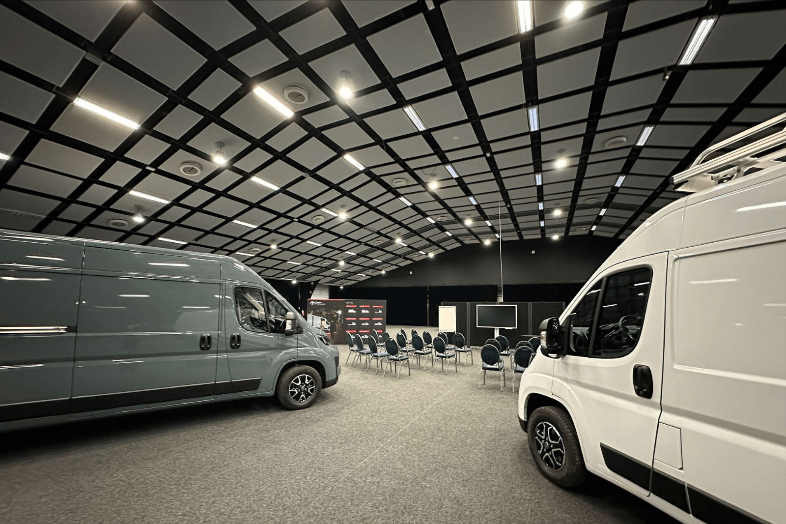 Salle d’événements spécialement conçue pour vos congrès, fêtes d’entreprise, présentations de produits, défilés de mode, banquets, etc. La hauteur de la pièce varie de 3 à 7 mètres et la salle dispose d’un plafond acoustique. Le revêtement de sol est constitué d’un tapis fixe de couleur anthracite. Grâce au parking adjacent, les camions peuvent facilement entrer et sortir, ce qui contribue à un montage et démontage rapide et facile de votre événement ou de votre foire.